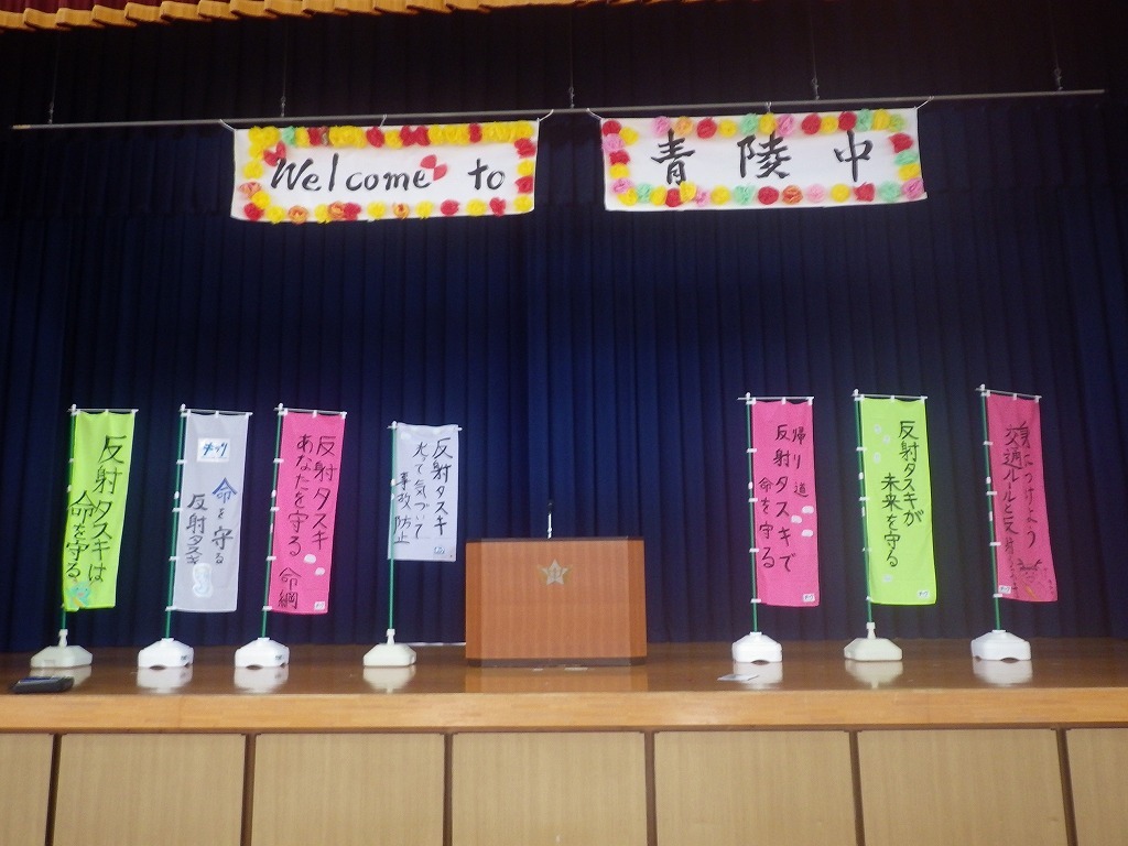 青陵中学校の生徒の皆さんは反射材着用による交通事故防止の思いを示したオリジナルののぼり旗を作成するなど、反射材着用に対する呼び掛けが強く感じることができました。