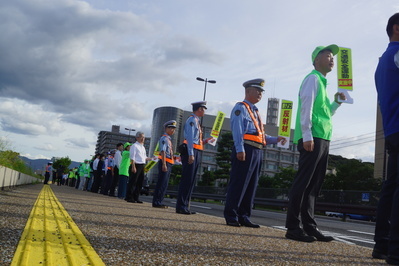 横断幕やハンドプレートを手に持ち、通行するドライバーに対し交通事故防止を呼びかけました。